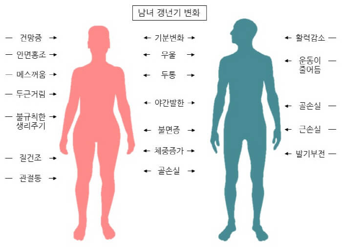 편두통, 뇌졸중, 안구건조, 구강건조, 소화불량, 위산역류, 위궤양, 당뇨, 고지혈증, 간경변, 변비, 요실금, 요도염, 치매, 자가면역, 면역력 저하, 수족냉증, 복부비만, 근육감소, 골다공증, 오십견, 석회화건염 등이 동반될 수 있습니다.