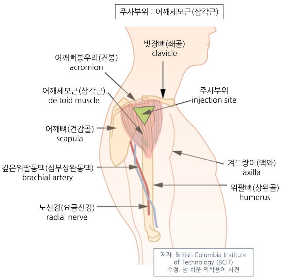 어깨세모근(삼각근, deltoid muscle)은 주로 1~2 ml 이하의 소량 주사에 이용되며 백신 접종이 포함됩니다. 어깨봉우리(견봉, acromion)에서 손가락 2개 만큼 떨어진 아래에 역삼각형 부위에 주사합니다.