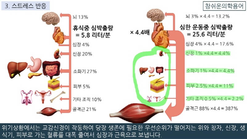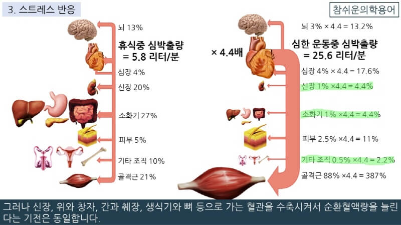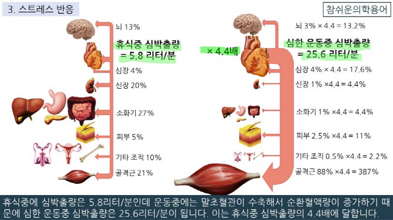물론 오른쪽 그림은 심한 운동중의 혈액분포이므로 가벼운 운동중의 심박출량이나 스트레스 반응중의 심박출량은 이보다 훨씬 적습니다.