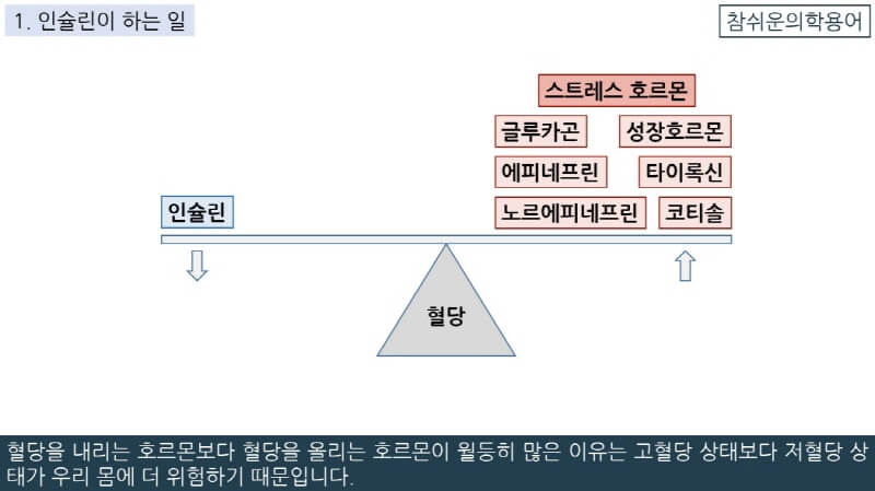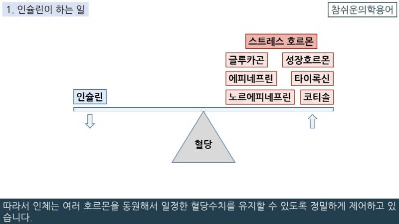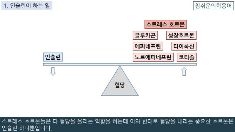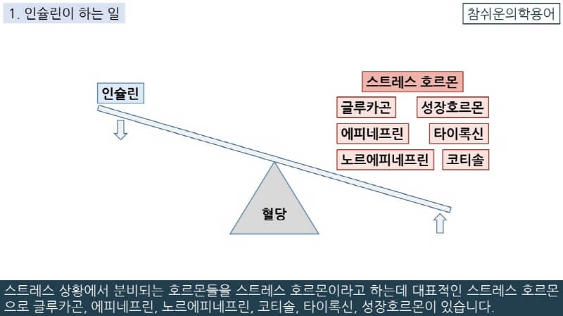 스트레스 호르몬들은 다 혈당을 올리는 역할을 하는데 이와 반대로 혈당을 내리는 중요한 호르몬은 인슐린 하나뿐입니다.