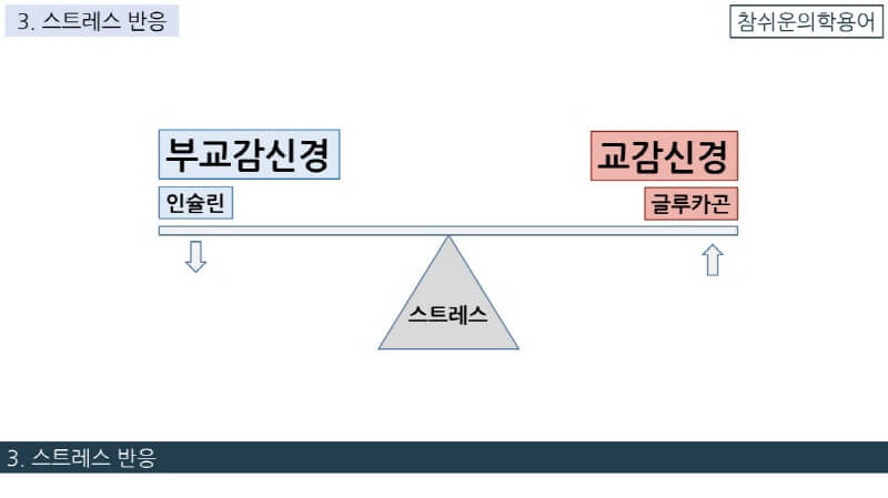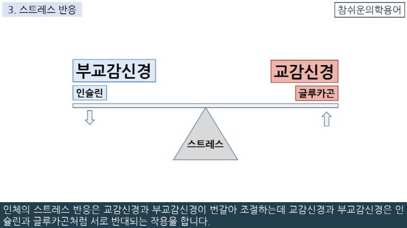 인체의 스트레스 반응은 교감신경과 부교감신경이 번갈아 조절하는데 교감신경과 부교감신경은 인슐린과 글루카곤처럼 서로 반대되는 작용을 합니다.