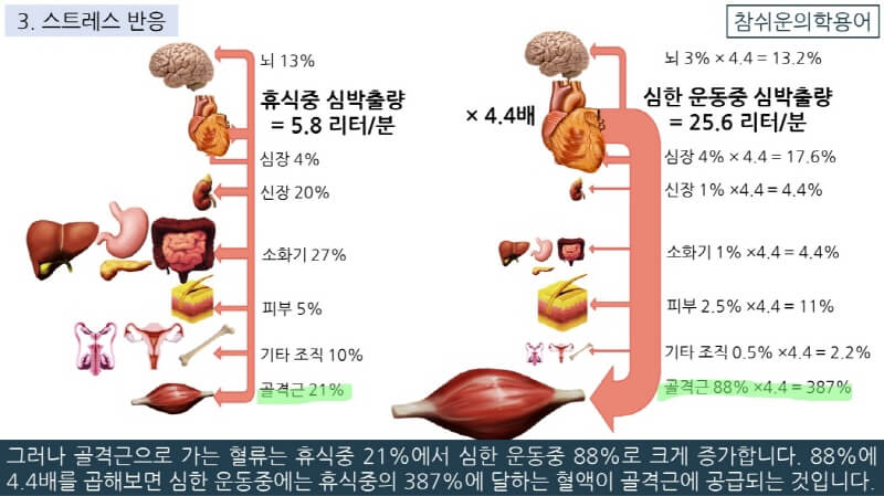 그러나 골격근으로 가는 혈류는 휴식중 21%에서 심한 운동중 88%로 크게 증가합니다. 88%에 4.4배를 곱해보면 심한 운동중에는 휴식중의 387%에 달하는 혈액이 골격근에 공급되는 것입니다.