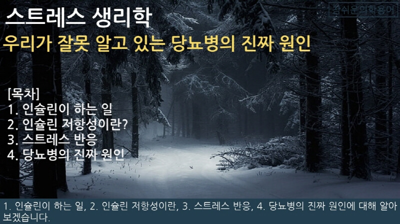 안녕하세요? 네이버 엑스퍼트 참쉬운의학용어입니다. 이번 시간에는 스트레스 생리학 - 우리가 잘못 알고 있는 당뇨병의 진짜 원인에 대해 알아보겠습니다.
