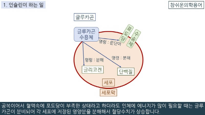 글루카곤의 신호를 받은 세포들은 포도당 수송체의 문을 닫아서 세포 안으로 포도당이 들어가지 못하게 하고 저장되어 있던 글리코겐, 단백질, 지방을 분해해서 에너지로 사용합니다.