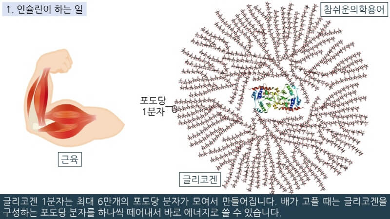 근육세포로 들어간 포도당의 일부는 근육이 운동하는 데 사용되고, 남는 포도당은 분자 하나하나가 사슬처럼 엮여서 글리코겐이라는 거대한 고분자 중합체로 변환되어 근육세포 내에 저장됩니다.