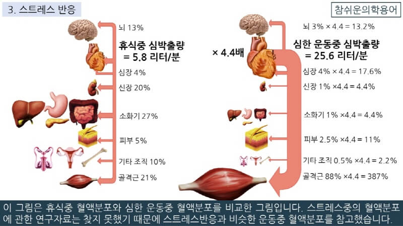 이 그림은 휴식중 혈액분포와 심한 운동중 혈액분포를 비교한 그림입니다. 스트레스중의 혈액분포에 관한 연구자료는 찾지 못했기 때문에 스트레스반응과 비슷한 운동중 혈액분포를 참고했습니다.