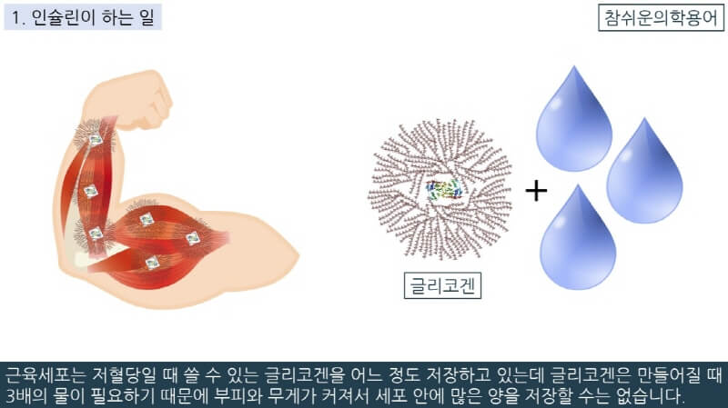 근육세포는 저혈당일 때 쓸 수 있는 글리코겐을 어느 정도 저장하고 있는데 글리코겐은 만들어질 때 3배의 물이 필요하기 때문에 부피와 무게가 커져서 세포 안에 많은 양을 저장할 수는 없습니다.