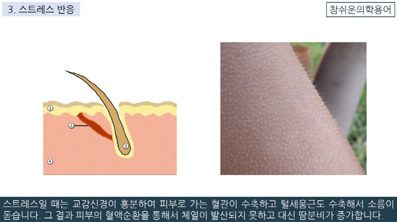 스트레스일 때는 교감신경이 흥분하여 피부로 가는 혈관이 수축하고 털세움근도 수축해서 소름이 돋습니다. 그 결과 피부의 혈액순환을 통해서 체열이 발산되지 못하고 대신 땀분비가 증가합니다.